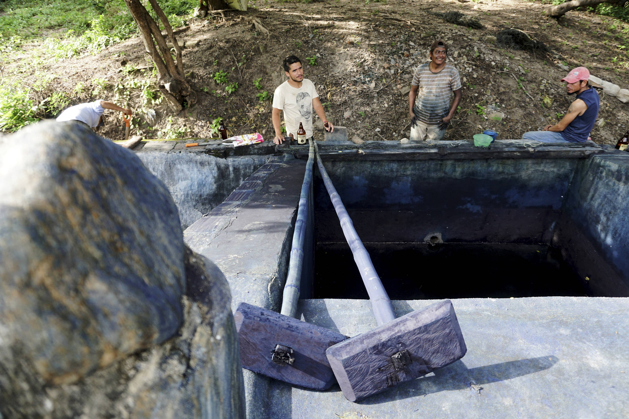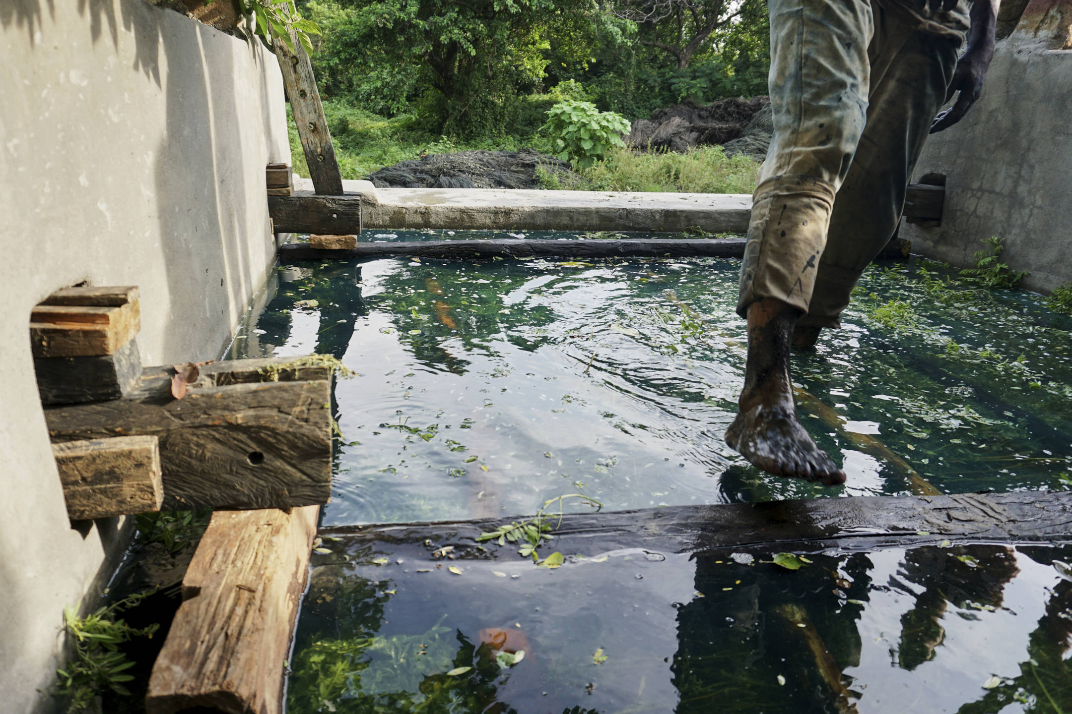 Hay tres etapas de la producción: siembra-cosecha, fermentación-pila y extracción. Después del corte que se hace una vez al año, antes de que lleguen los grandes vientos del sur, las ramas del xiquilite se amarran y se llevan a tres estanques de cemento: las que usan en Niltepec tienen más de 100 años de antigüedad.